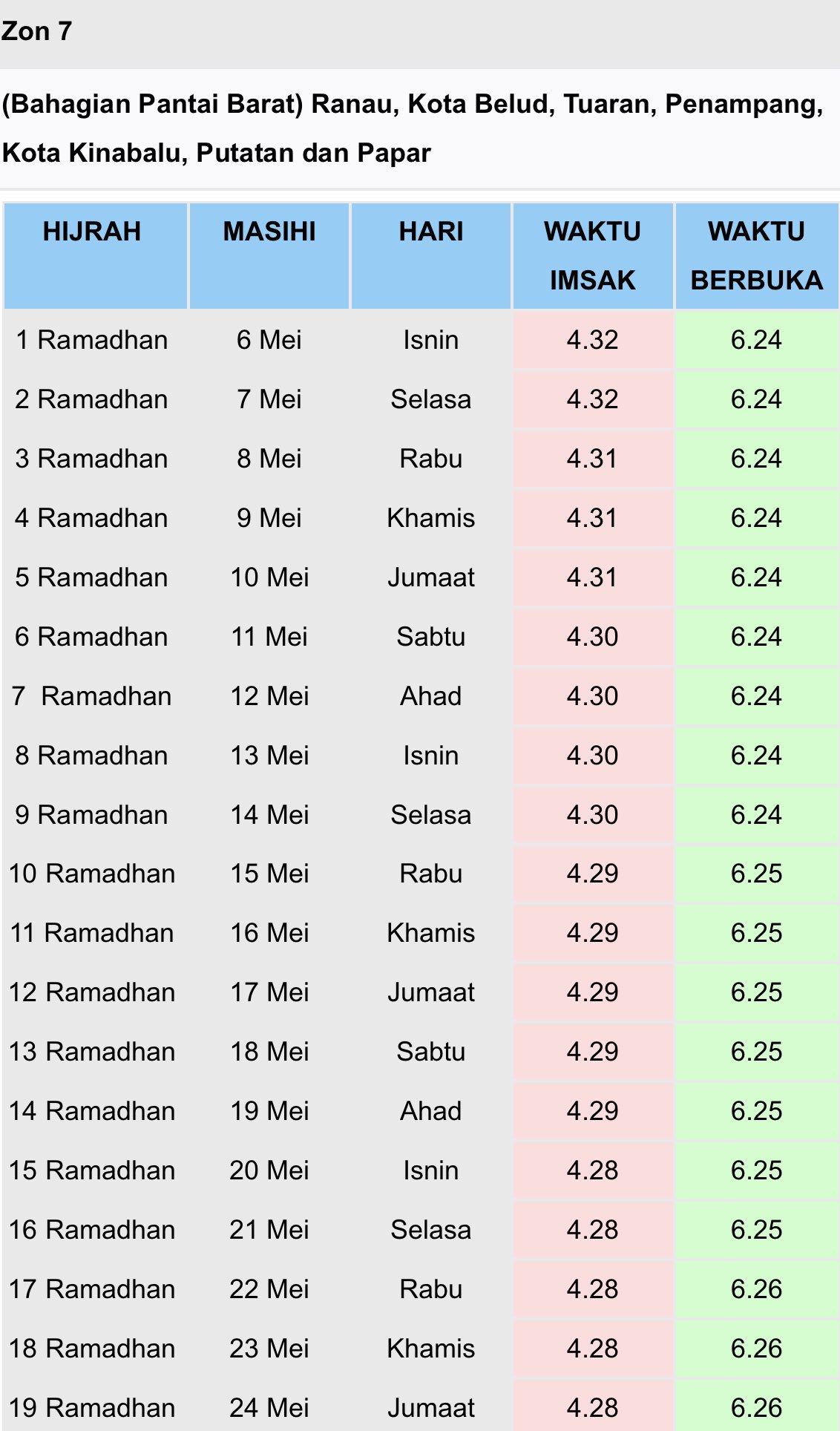Tingkat 14 Jabatan Perkhidmatan Awam Negeri Sabah PPANS Persatuan Badan Kebajikan Islam JPANS telah mengadakan Majlis Berbuka Puasa dan Solat Terawih pada 29 Mei 2019 yang lalu. Jadual waktu berbuka puasa imsak sabah disusun mengikut 9 zon di negeri sabah berdasarkan takwim esolat jakim tahun 2022 1443h. Gunung kinabalu ketinggian 4101m ramadan 1440h mei jun 2019m waktu imsak waktu berbuka hari hijriah miladiah isnin 1 6 mei 429 pagi 630 malam selasa 2 7 429 630 rabu 3 8 428 630 khamis 4 9 428 630.